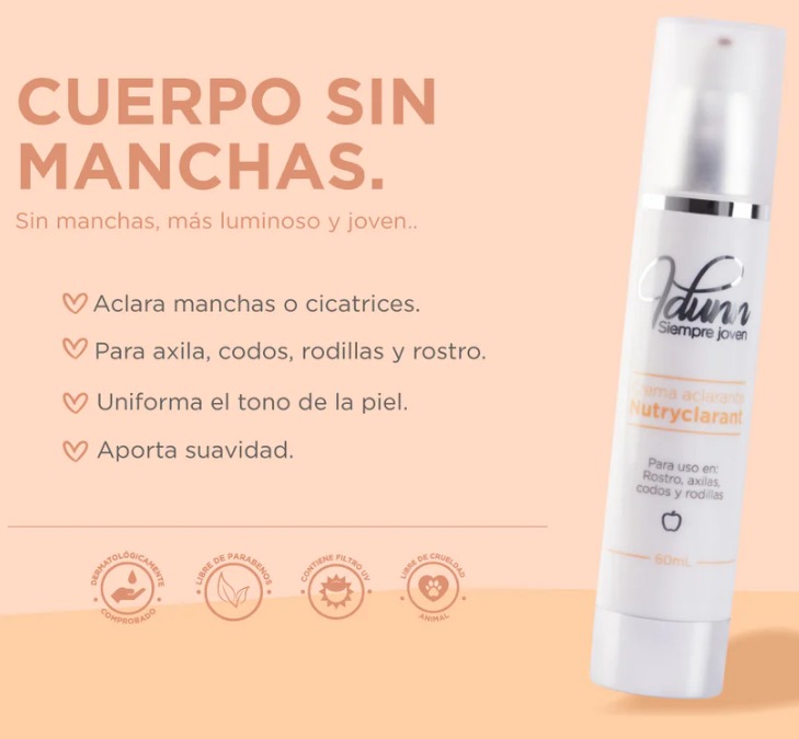 Aclara manchas o cicatrices del rostro, axilas, codos y rodillas. Da uniformidad al color del rostro, aporta suavidad ya que contiene colágeno y elastina.