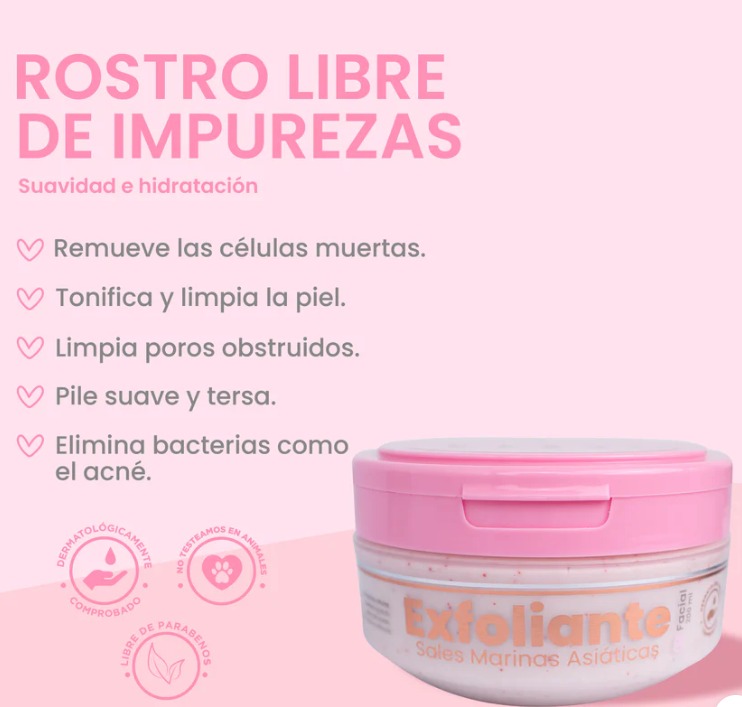 Remueve las células muertas, tonifica y limpia la piel, limpia poros obstruidos. Deja la piel suave y tersa. Elimina bacterias como el acné.