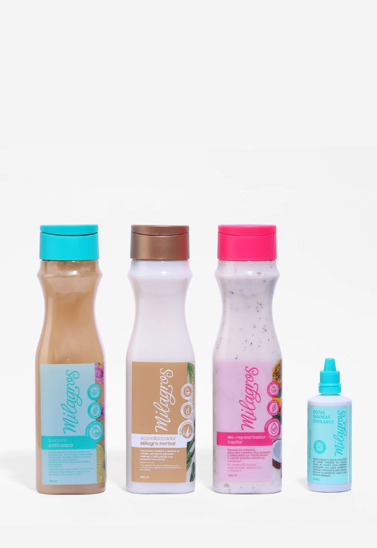 Productos: Bio-Repolarizador Capilar Shampoo Anti-caspa Acondicionador Milagro Herbal Gotas Mágicas Capilares.