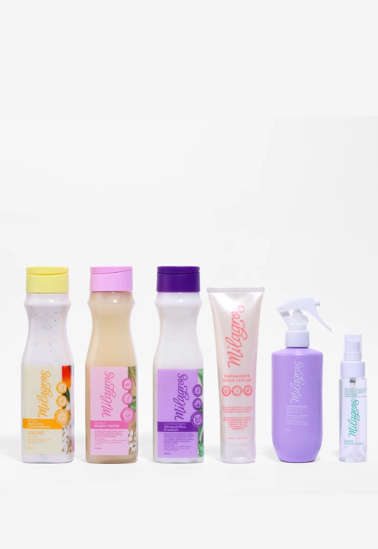 Incluye: Shampoo Magia, Tratamiento Rizos, Acondicionador Ultra, Desenredante Termoprotector, Tratamiento Magia y Sérum Revitalizante — la combinación ideal para rizos suaves, definidos y llenos de brillo.